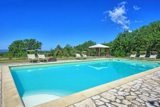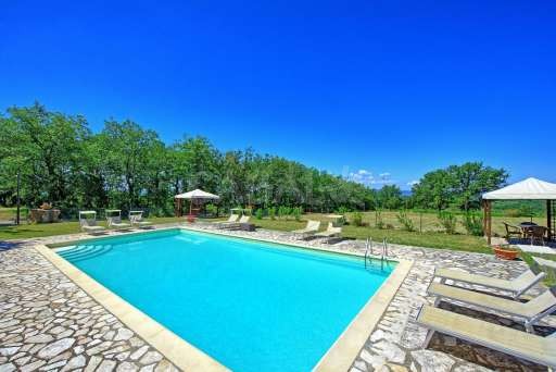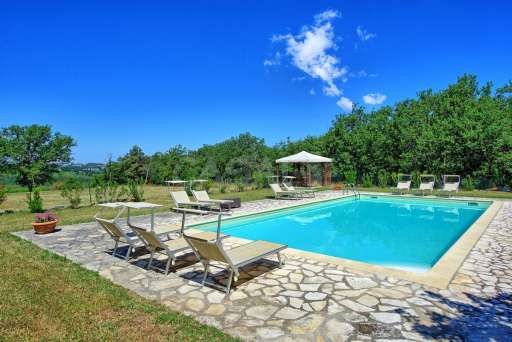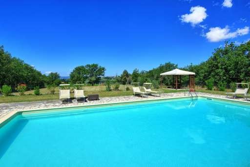 Der eigene Pool dieser Ferienanlage mit großzügiger Liegewiese verspricht Entspannung und auch Bewegung.