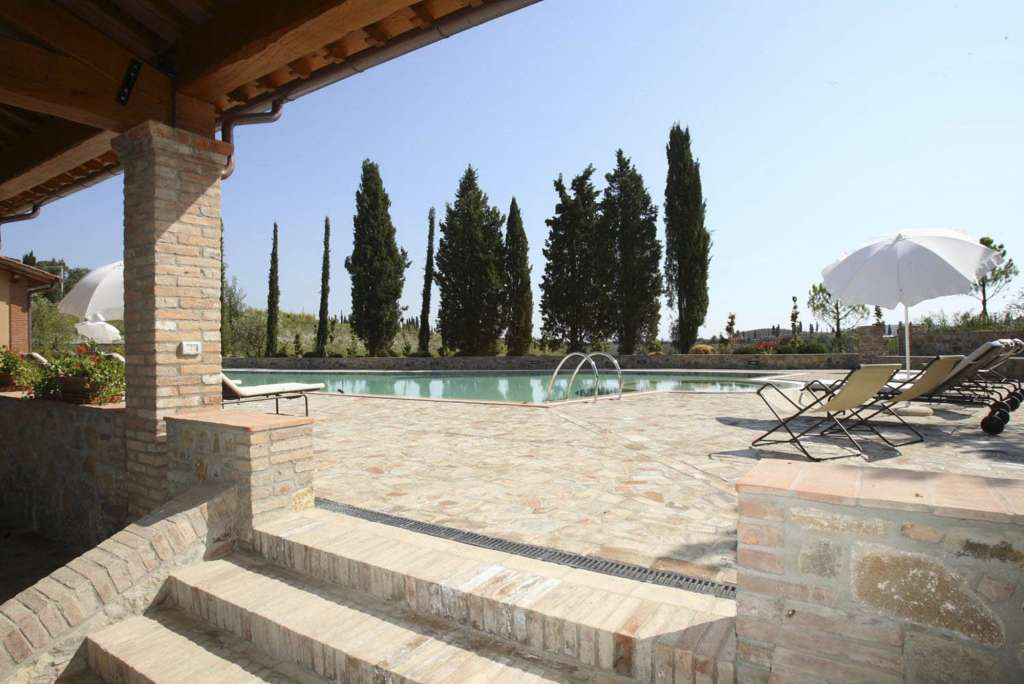 Villa Montaione befindet sich in den Hügeln des Elsatals, das sich auf der einen Seite von San Gimignano bis zur Ebene von Pisa erstreckt und auf der anderen zur Etruskerstadt Volterra. Hier finden wir das typisch toskanische Landschaftsbild mit kleinen Wäldern, Feldern und Olivenhainen. Die Villa genießt von allen Seiten ein schönes Panorama, das sich durch die für die Toskana typischen auszeichnet. Die Anlage setzt sich zusammen aus dem Haupthaus und 2 Dependancen und ist daher ideal für Gruppen oder Familien, die ihren Urlaub gemeinsam verbringen möchten, ohne auf eine gewisse Privatsphäre verzichten zu müssen. Hier gibt es ausgezeichnete Ausflugsmöglichkeiten, berühmte Städte wie San Gimignano mit ihren Türmen, Volterra und Siena sind bequem über wenig befahrene Straßen zu erreichen. Der schöne Außenbereich mit einem großen Pool unregelmäßiger Form (7 x 21 m; Tiefe: 1,20-2,50 m - geöffnet 01.05.-15.09), mit Whirlpoolbereich, Liegen und Sonnenschirmen sowie eine große, ausgestattete Loggia ausgestattet.